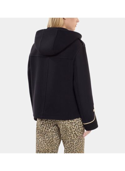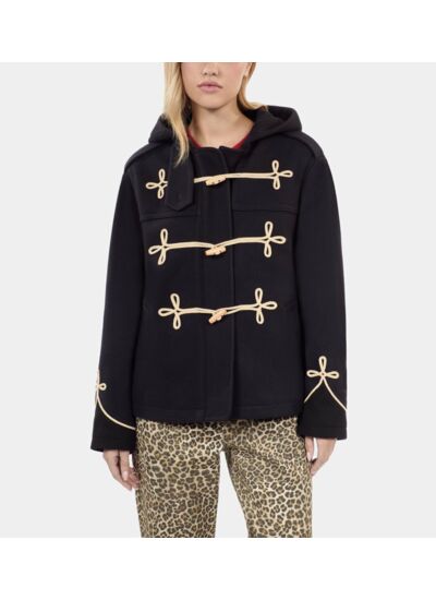 Manteau femme The Kooples, caban court à capuche, couleur bleu marine. Tissu extérieur résistant et doublure confortable. Fermeture frontale solide. Coupe ajustée, longueur courte.