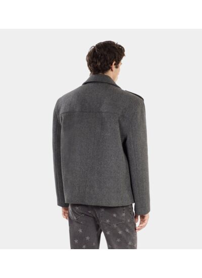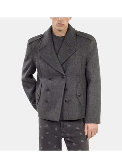 Manteau homme en laine mélangée, motif chevron noir, coupe courte. Fermeture par boutons, col classique, poches latérales. Marque : The Kooples.