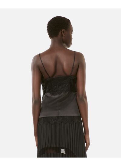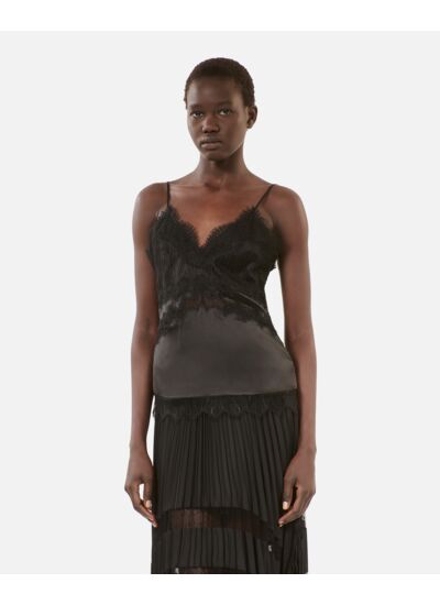 Marque : The Kooples. Matière : soie avec détails en dentelle. Coupe ajustée. Zip latéral invisible. Décolleté en V devant et dos. Transparence sous la poitrine. Fines bretelles. Détails en dentelle ton sur ton.