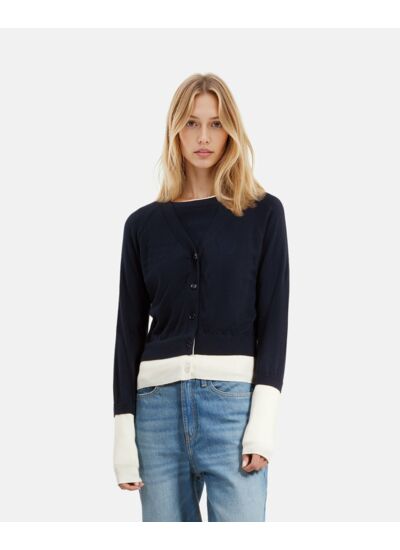 Marque : The Kooples. Coupe ajustée. Col V. Manches longues contrastées. Bords côtes. Broderie blason The Kooples à la poitrine. Boutons ton sur ton. Conseil taille : choisir la taille au-dessus en cas d’hésitation.