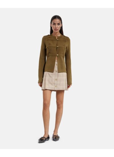 Conçu pour une allure moderne, ce cardigan se distingue par son col officier et ses pattes d’épaule qui apportent une touche structurée. Le boutonnage devant orné de boutons héritage renforce son caractère sophistiqué, tandis que la coupe droite assure un porté confortable et fluide. Polyvalent, il se marie aussi bien avec un jean qu’une jupe pour un look affirmé.