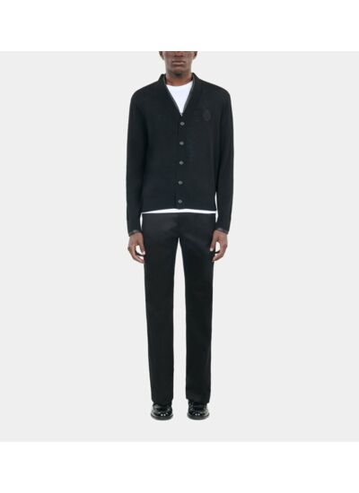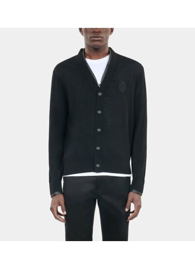 Adoptez l’élégance intemporelle avec ce cardigan en laine mérinos noire signé The Kooples. Une pièce essentielle pour affirmer un style raffiné et confortable en toute saison.
