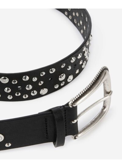 Conçue dans un cuir noir de qualité, cette ceinture se distingue par ses clous métalliques qui soulignent son caractère unique. Elle s’adapte aussi bien à un jean brut qu’à une robe fluide, offrant une polyvalence rare. Son allure moderne et ses finitions soignées incarnent l’esprit urbain et sophistiqué de la marque.