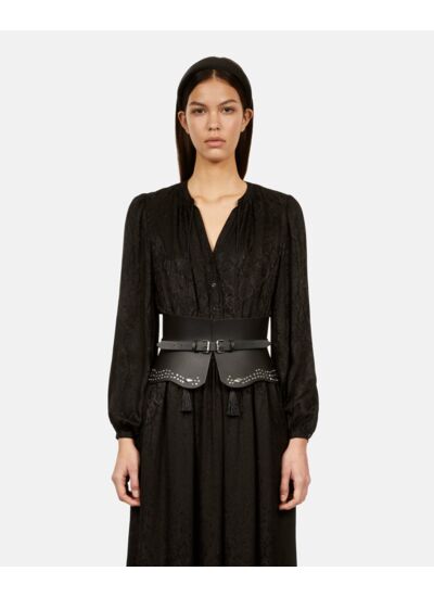 Affirmez votre style avec cette ceinture corset en cuir noir, un accessoire audacieux qui structure votre silhouette avec élégance. Son design extra large et ses clous métalliques apportent une touche rock et sophistiquée à toutes vos tenues.