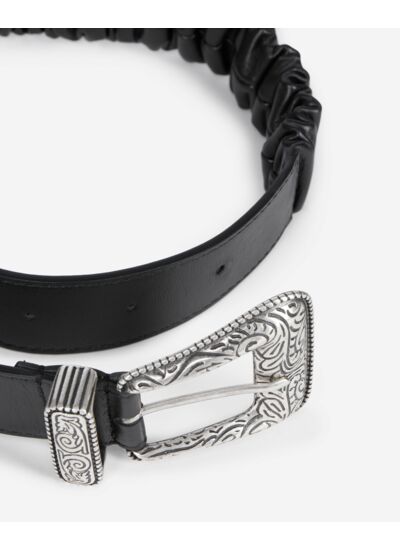 Marque : The Kooples. Matière : cuir lisse froncé. Boucle : western argentée. Largeur : 3,5 cm. Longueur T1 : 77 cm.