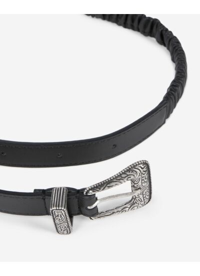 Conçue en cuir lisse froncé, cette ceinture incarne la qualité et la sophistication. Sa boucle western argentée apporte un détail distinctif, résolument tendance, qui capte le regard sans en faire trop. Sa largeur fine de 1,5 cm permet une polyvalence parfaite, s’adaptant aussi bien aux pantalons qu’aux robes cintrées.