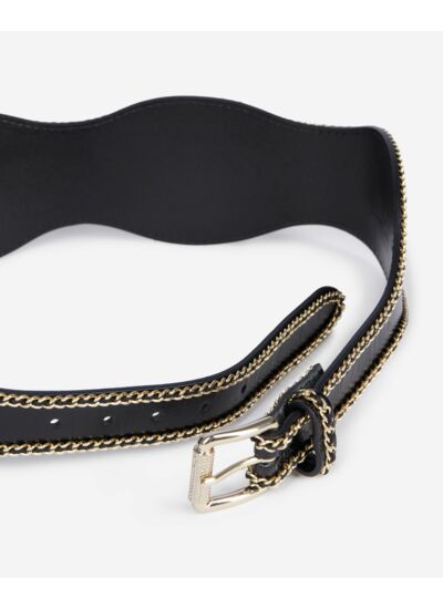 Conçue en cuir lisse de qualité, cette ceinture se distingue par sa chaîne et sa boucle classique en métal doré, qui apportent une finition raffinée et moderne. Sa largeur de 7 cm offre une présence marquée à la taille, idéale pour structurer vos looks tout en restant confortable. Que ce soit sur une robe fluide ou un jean, elle rehausse instantanément votre silhouette.