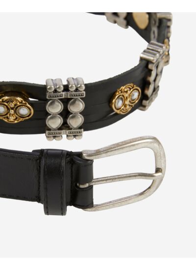 Confectionnée en cuir lisse de qualité, cette ceinture allie robustesse et sophistication. La boucle et les empiècements en métal doré apportent une touche rock chic, parfaite pour dynamiser un jean ou structurer une robe fluide. Son allure contemporaine s’adapte aussi bien à un look casual qu’à une tenue plus travaillée, pour un effet mode garanti.