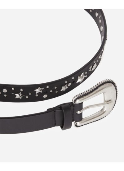 Conçue en cuir lisse de qualité, cette ceinture se distingue par sa boucle et ses étoiles en métallerie argentée, apportant une touche contemporaine et raffinée. Son design épuré s’adapte aussi bien à un jean casual qu’à une robe structurée, pour un look résolument moderne et affirmé.