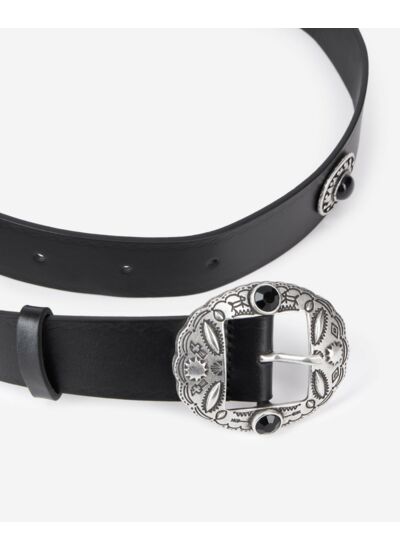Affirmez votre style avec cette ceinture en cuir noir, alliant élégance brute et détails métalliques audacieux. Un accessoire incontournable pour sublimer toutes vos tenues avec une touche rock-chic.