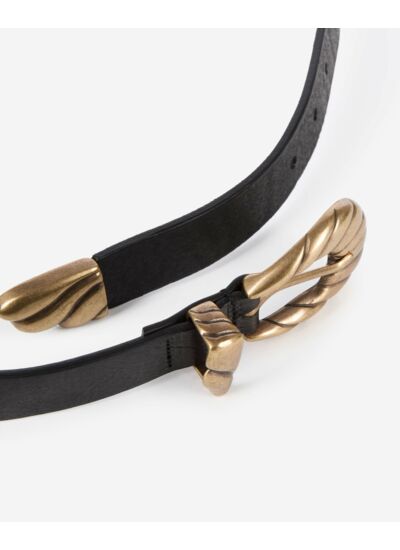 Cette ceinture femme The Kooples est en cuir lisse noir, équipée de deux boucles gravées avec une métallerie dorée. Elle mesure 2,5 cm de largeur et la taille T1 correspond à une longueur de 70 cm.