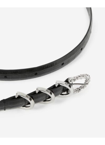 Largeur : 2 cm. Longueur : taille 1 – 95 cm. Cuir embossé effet crocodile noir. Boucle et passants en métallerie argentée. Marque : The Kooples.