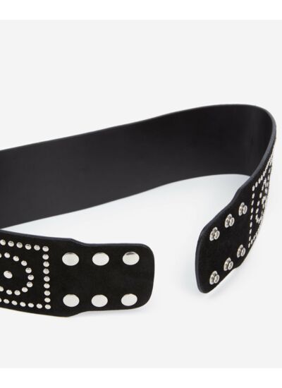 Fabriquée par The Kooples, cette ceinture femme en cuir suède noir mesure 7,5 cm de largeur et 74 cm de longueur en taille 1. Elle est ornée de clous en métallerie argentée qui renforcent son allure distinctive.