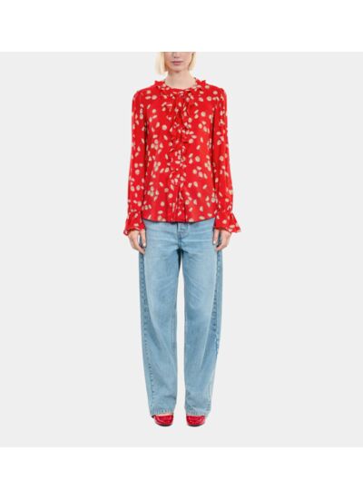 Fabriquée par The Kooples, cette chemise femme se distingue par son col rond avec volants, ses manches longues aux poignets élastiqués également agrémentés de volants, sa patte de boutonnage simple et ses boutons recouverts. L’imprimé floral rouge et blanc apporte une note élégante et moderne.