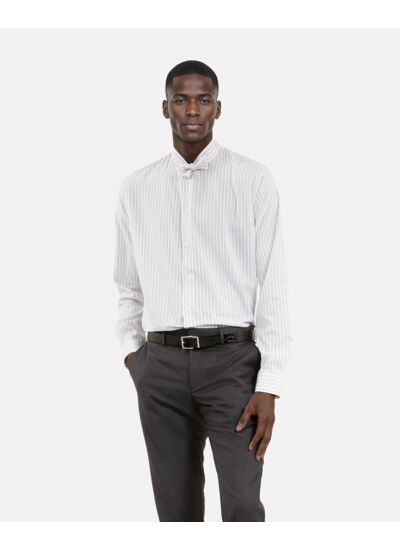Cette chemise homme The Kooples présente une coupe droite, un col à nouer, des manches longues avec boutons aux poignets, une patte de boutonnage américaine et des boutons nacrés.