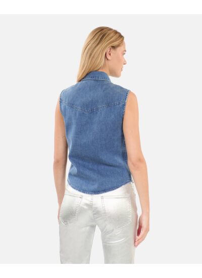 Fabriquée par The Kooples, cette chemise en denim bleu présente une coupe ajustée, un col classique, des poches plaquées à rabat, une fermeture à boutons pression marbrés et une conception sans manches pour un confort optimal.