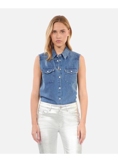 Affirmez votre style avec cette chemise en denim bleu sans manches signée The Kooples, alliant modernité et élégance décontractée. Une pièce incontournable pour une silhouette nette et tendance.