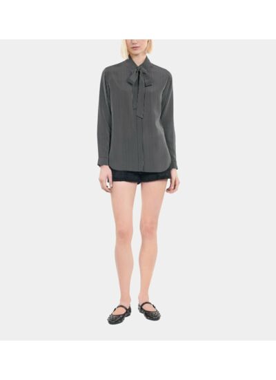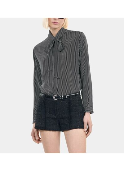 Marque : The Kooples. Matière : soie. Coupe droite. Rayures noires et blanches. Col classique avec lavallière amovible. Patte de boutonnage couverte. Manches longues avec boutons noirs aux poignets.