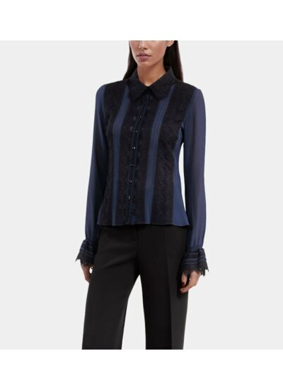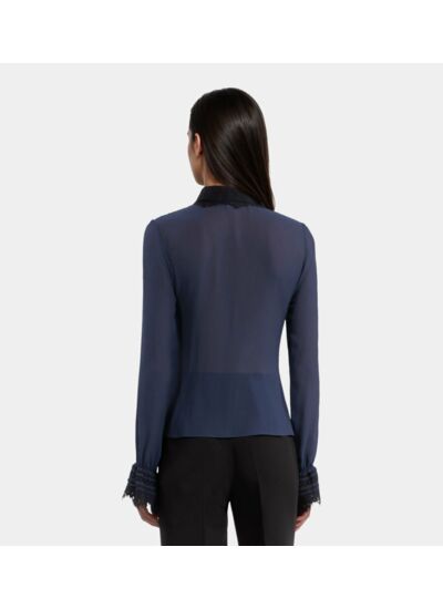 Conçue pour épouser parfaitement la silhouette, cette chemise ajustée met en valeur votre féminité grâce à son col classique et sa patte de boutonnage simple. Les manches longues se terminent par des poignets élastiqués ornés de volants délicats, apportant une touche de légèreté et de mouvement. Les empiècements en dentelle noire contrastent subtilement avec la douceur de la soie, créant un jeu de textures raffiné et sophistiqué.