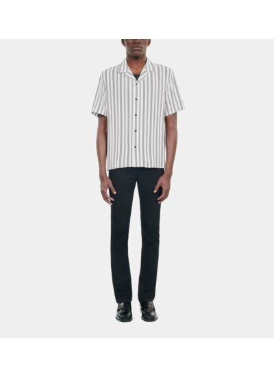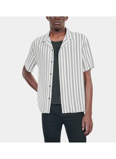 Fabriquée en tissu léger et fluide, elle présente une coupe droite classique, un col hawaïen, des manches courtes, une patte de boutonnage simple avec boutons noirs. L’imprimé rayures blanc et noir apporte une modernité graphique à ce modèle signé The Kooples.