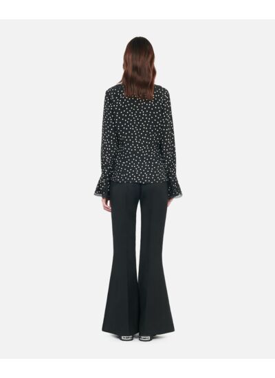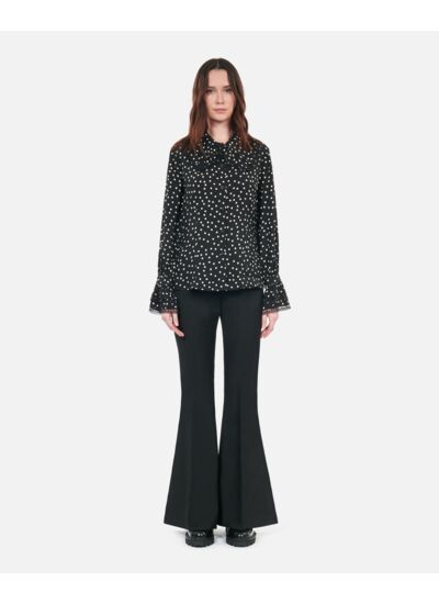 Marque : The Kooples. Chemise femme ajustée. Imprimé pois noir et blanc. Col classique avec volants et dentelle. Patte de boutonnage simple. Manches longues avec volants et dentelle. Boutons bijoux.
