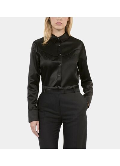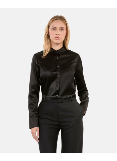 Marque : The Kooples. Chemise femme ajustée en satin noir. Col classique. Patte de boutonnage américaine. Manches longues avec boutons aux poignets. Poches passepoilées. Fermeture par boutons pression.