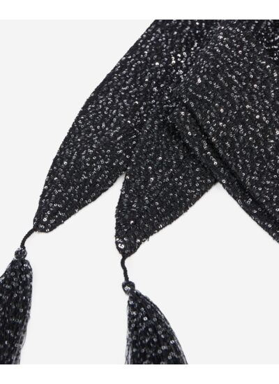 Dimensions : 200 cm de long sur 7 cm de large. Matière : maille fine noire avec sequins brodés. Finition pompon à franges pour une touche finale raffinée. Marque : The Kooples.