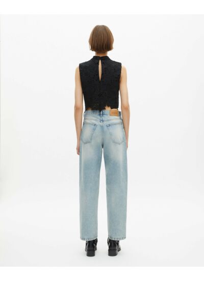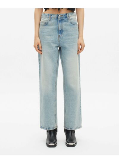 Fabriqué en denim bleu clair, ce jean présente une taille mi-haute, des poches avant et arrière classiques, ainsi qu’une fermeture zippée avec bouton. La coupe boyfriend assure une aisance remarquable tout en valorisant la silhouette féminine.