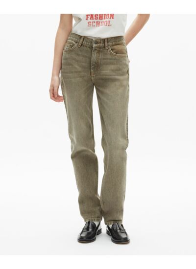 Jean femme The Kooples en denim délavé, coupe slim, taille moyenne avec passants, fermeture à zip et bouton, cinq poches.