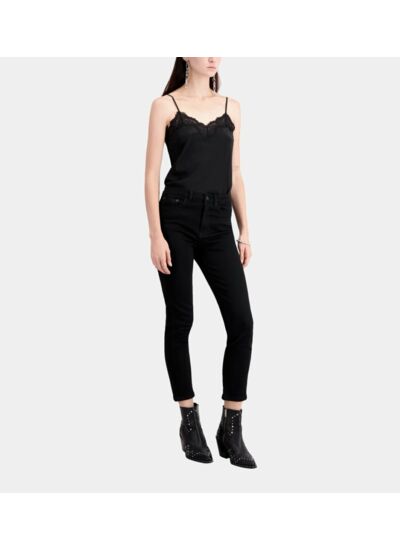 Conçu pour épouser les formes tout en offrant une liberté de mouvement, ce jean taille haute met en valeur la taille grâce à sa coupe slim et ses passants pratiques. Les bandes twill latérales apportent une touche graphique subtile, tandis que le rivet tête de mort sur la poche ticket affirme un esprit rock chic distinctif. Polyvalent, il se porte aussi bien avec un blazer structuré qu’un t-shirt décontracté.