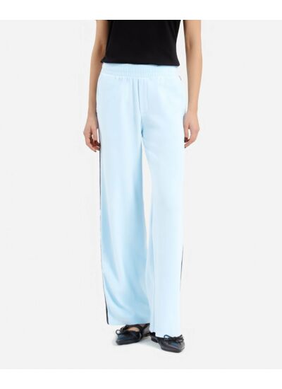 Taille élastiquée pour un ajustement flexible, jambe droite pour une silhouette allongée, poches latérales invisibles pour plus de fonctionnalité, bande latérale contrastée pour un effet visuel moderne, patch logo devant et logo strass au dos pour une finition élégante.