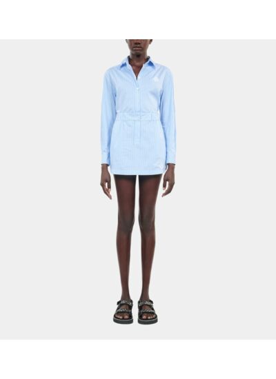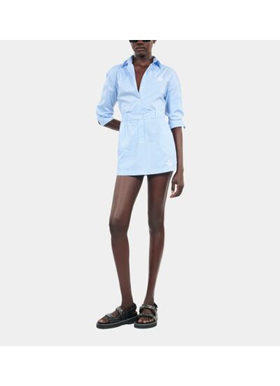 Réponse. La jupe présente des rayures bleues et blanches.