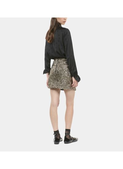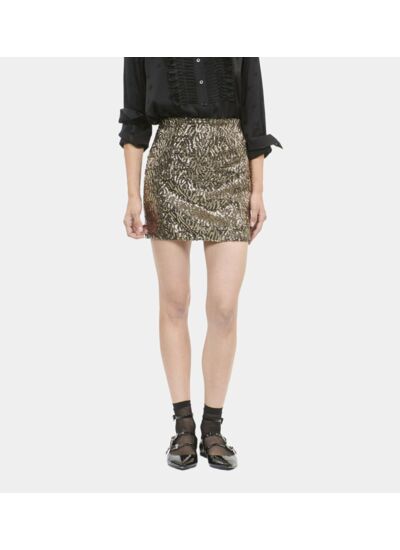 Brillez intensément lors de vos soirées avec cette jupe courte à sequins dorée signée The Kooples. Une pièce audacieuse qui transforme chaque mouvement en éclat.