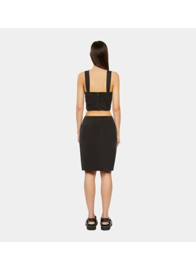Drapé devant pour un effet plissé subtil, fermeture avec zip invisible, jupe doublée pour plus de confort, longueur 53 cm pour une taille 36.