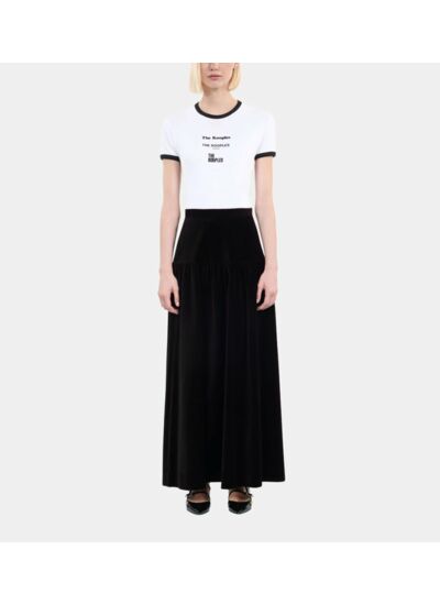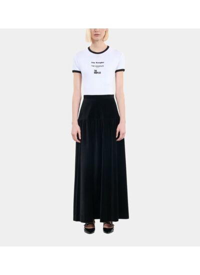 Fabriquée par The Kooples, cette jupe est conçue dans un velours noir de qualité supérieure, garantissant résistance et confort. Sa coupe longue et fluide est pensée pour flatter toutes les morphologies, avec une taille ajustée qui souligne la silhouette sans serrer.