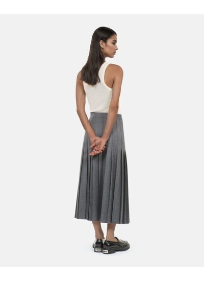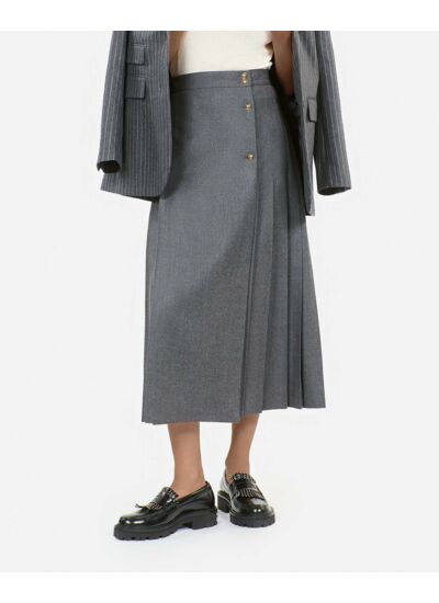 Fabriquée en laine de qualité, cette jupe longue présente un plissé permanent et une taille ajustée pour un maintien optimal. Sa teinte grise versatile facilite l’association avec une large palette de couleurs et styles.