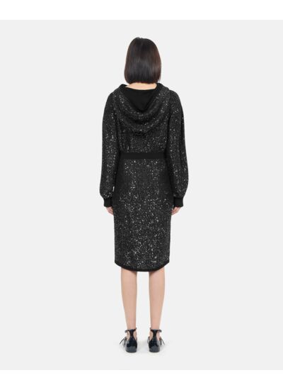 Vous apprécierez sa longueur idéale de 59 cm (pour une taille 36) qui équilibre parfaitement modernité et sophistication. La coupe ajustée met en valeur vos courbes tandis que les sequins apportent une brillance subtile sans en faire trop.