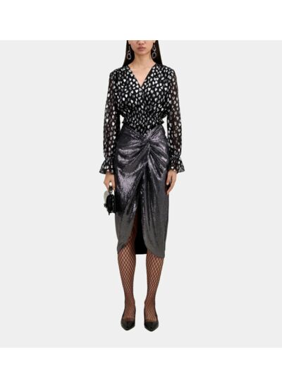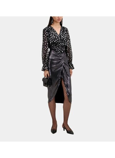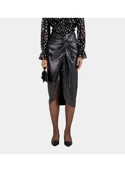 Caractéristiques techniques : jupe mi-longue métallisée, fente devant, effet drapé noué à la taille, fermeture par zip invisible, longueur 80 cm pour une taille 36. Marque : The Kooples.