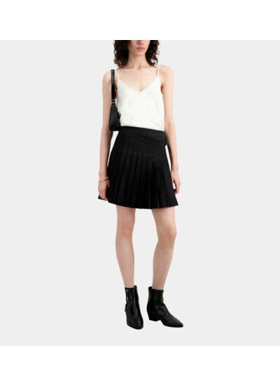 Cette jupe plissée courte présente une coupe droite légèrement évasée, une ceinture en cuir avec boucle, et une longueur de 44 cm pour une taille 36. Marque : The Kooples.
