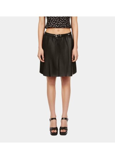 Fabriquée en cuir lisse, elle présente une ceinture avec boucle western et une métallerie argentée. La longueur est de 42 cm pour une taille 36, assurant une coupe courte et flatteuse.