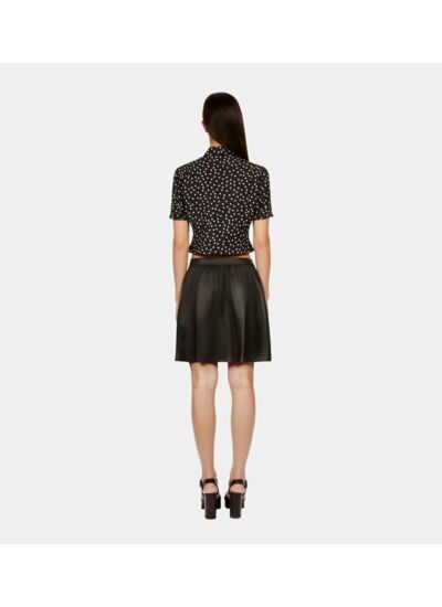 Réponse : Il est recommandé de nettoyer la jupe avec un chiffon doux et un produit spécifique pour cuir, en évitant l’eau et les solvants agressifs.