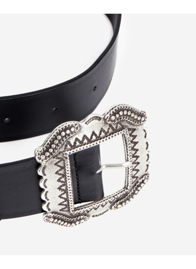 Conçue en cuir lisse agrémenté de motifs embossés subtils, cette ceinture impose une allure sophistiquée et contemporaine. La boucle en métallerie argentée apporte une touche de caractère, tandis que sa largeur généreuse de 4,5 cm souligne la taille avec assurance. Polyvalente, elle s’adapte aussi bien à un jean qu’à une robe fluide pour structurer la silhouette.