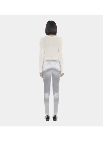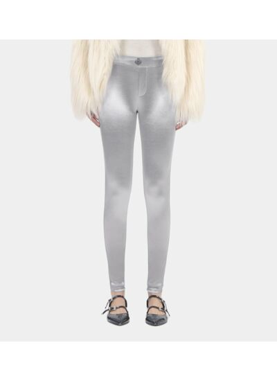 Matière satinée argentée, coupe slim, taille élastique pour un ajustement confortable. Disponible en plusieurs tailles pour convenir à toutes les morphologies.