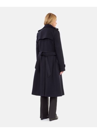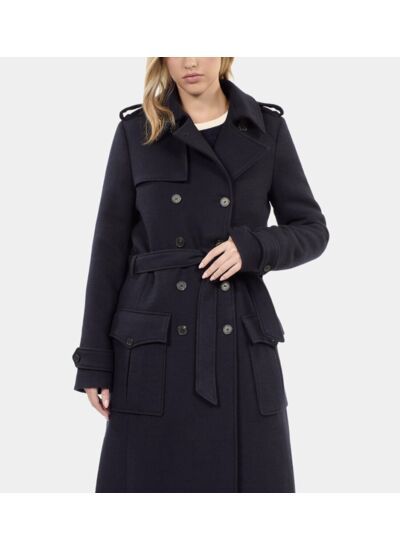 Manteau long style trench bleu marine signé The Kooples, conçu en tissu résistant. Coupe droite avec ceinture à nouer, col classique, manches longues, poches latérales discrètes. Fermeture boutonnée sur le devant.
