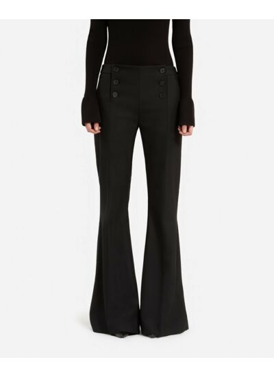 Pantalon femme The Kooples, taille haute, jambe flare, boutonnage devant. Poches latérales invisibles et poches passepoilées au dos. Boutons héritage pour une finition soignée.