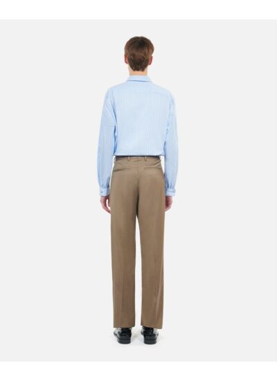 Fabriqué en laine italienne, il présente une coupe droite, une taille moyenne avec ceinture intégrée, des plis cassés avant et arrière, des poches latérales italiennes, des poches dos passepoilées, ainsi qu’une fermeture zippée avec bouton de rappel et agrafe pour un maintien parfait.