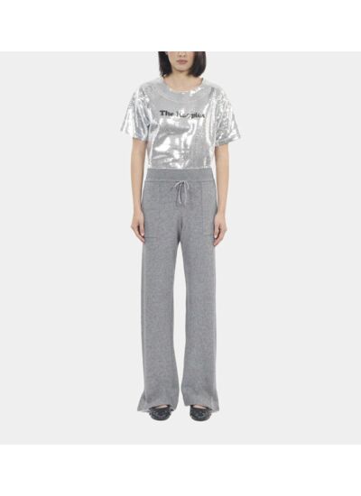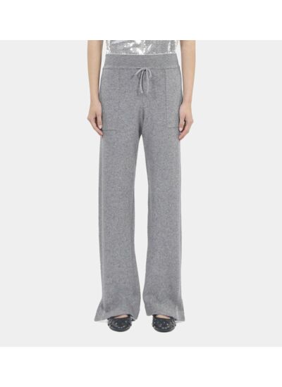 Marque : The Kooples. Matière : laine et cachemire. Coupe : taille haute, jambe droite. Détails : cordon de serrage, poches latérales invisibles, poches plaquées au dos, finitions en maille satinée. Couleur : gris.