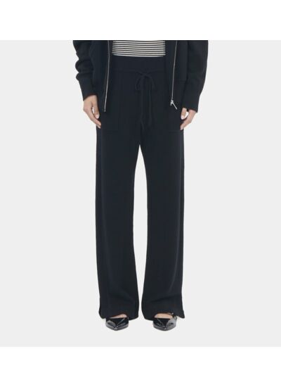 Matière : laine et cachemire. Coupe : taille haute, jambe droite. Détails : cordon de serrage à la taille, poches latérales invisibles, poches plaquées au dos, finitions en maille satinée. Marque : The Kooples.