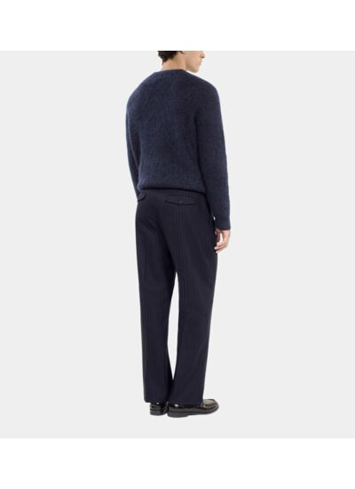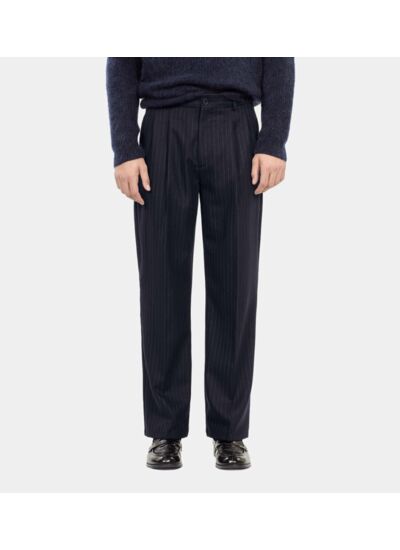 Confectionné dans un tissu fluide et léger, ce pantalon offre une coupe ample qui libère vos mouvements tout en apportant une touche graphique grâce à ses rayures verticales. Son coloris bleu marine s’intègre facilement à toutes vos tenues, du casual chic au plus formel, pour un look résolument contemporain.