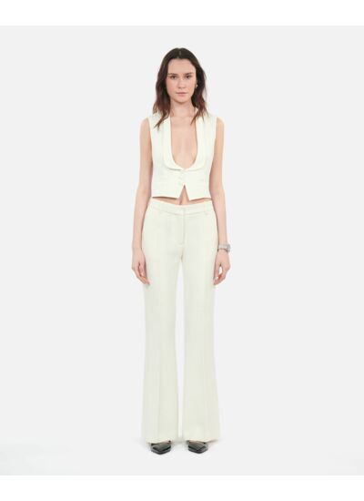 Pantalon femme The Kooples en laine et coton, taille haute avec passants, jambe flare. Poches latérales italiennes, poches dos passepoilées. Fermeture zippée avec bouton de rappel et agrafe.